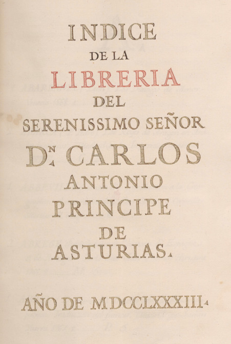 Índice de la librería del sereníssimo señor dn. Carlos Antonio Príncipe de Asturias. Año de 1783